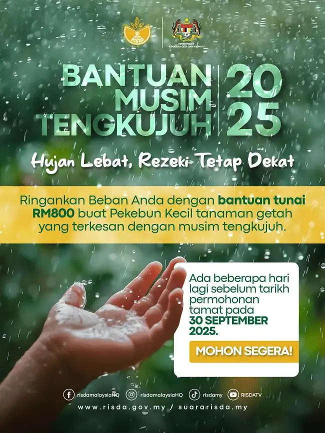 Bantuan Buat Pekebun Kecil Dan Penoreh Getah RISDA Tahun 2025. Makluman kepada pekebun dan penoreh getah yang terjejas daripada melakukan sebarang aktiviti pertanian sepanjang musim tengkujuh. Kerajaan Malaysia melalui Pihak Berkuasa Kemajuan Pekebun Kecil Perusahaan Getah atau dikenali sebagai RISDA akan membuka permohonan Bantuan Musim Tengkujuh bagi memastikan kebajikan para pekebun kecil terpelihara.