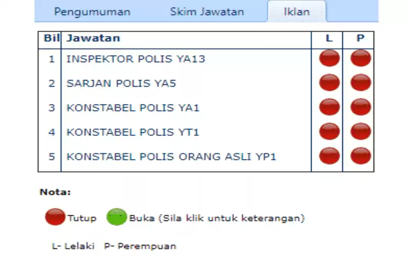 Permohonan jawatan kosong terkini Polis adalah untuk jawatan Sarjan Polis Gred YA5 (Lelaki/ Wanita) dan Konstabel Polis Gred YT1 (Lelaki/ Wanita).