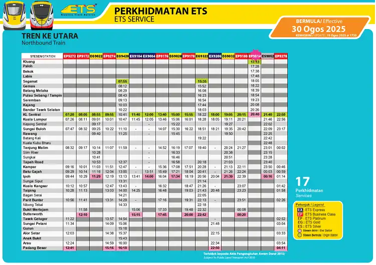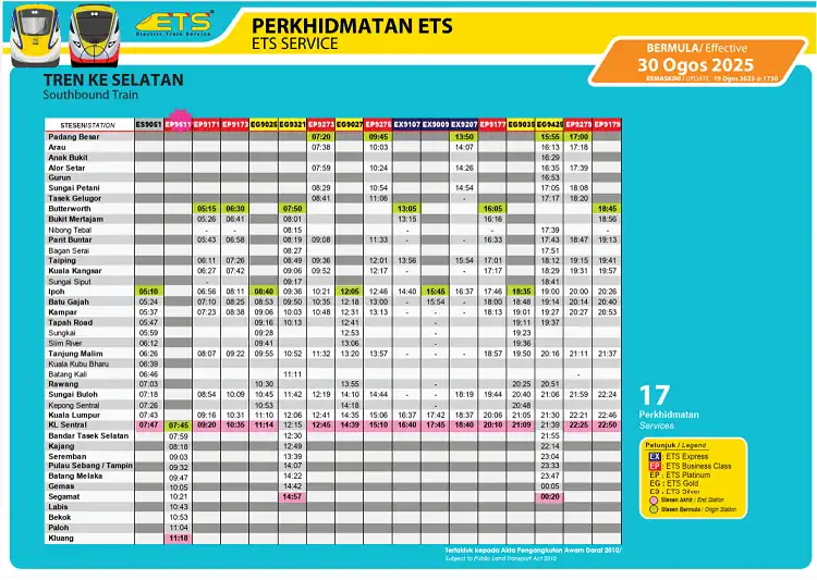 ETS Train Timetable 2025 KTM (Laluan Kluang – KL Sentral – Padang Besar)