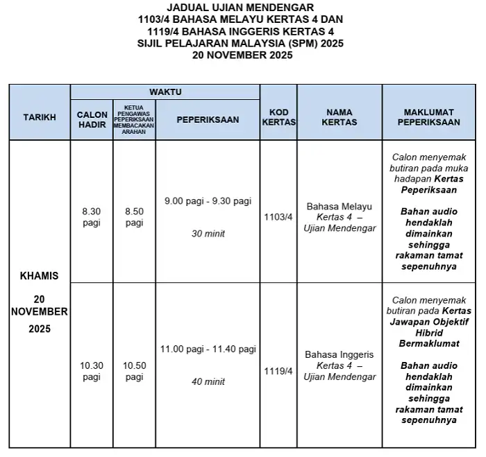 Jadual Waktu Peperiksaan SPM 2025 (Tarikh)