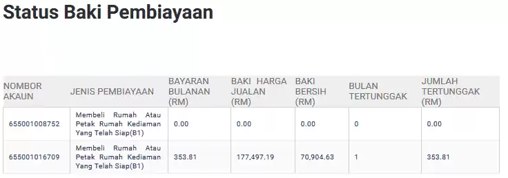 - Untuk semakan status baki pembiayaan, paparan akan dikeluarkan seperti: