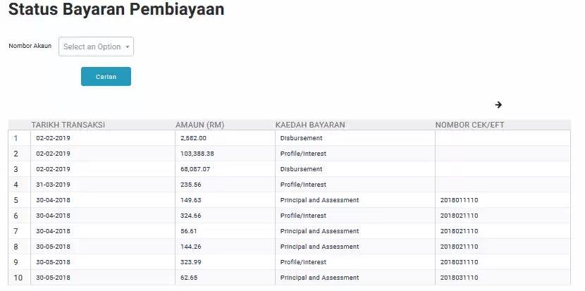 - Dan paparan semakan status bayaran pembiayaan adalah seperti berikut: