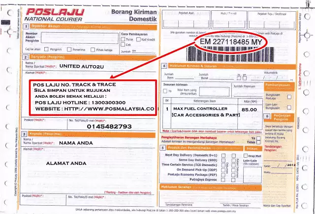 Nombor Tracking boleh didapati di borang yang diisi oleh pengirim dan slip salinan juga akan diberikan sebagai rujukan. Rujuk gambar berikut untuk keterangan lanjut.