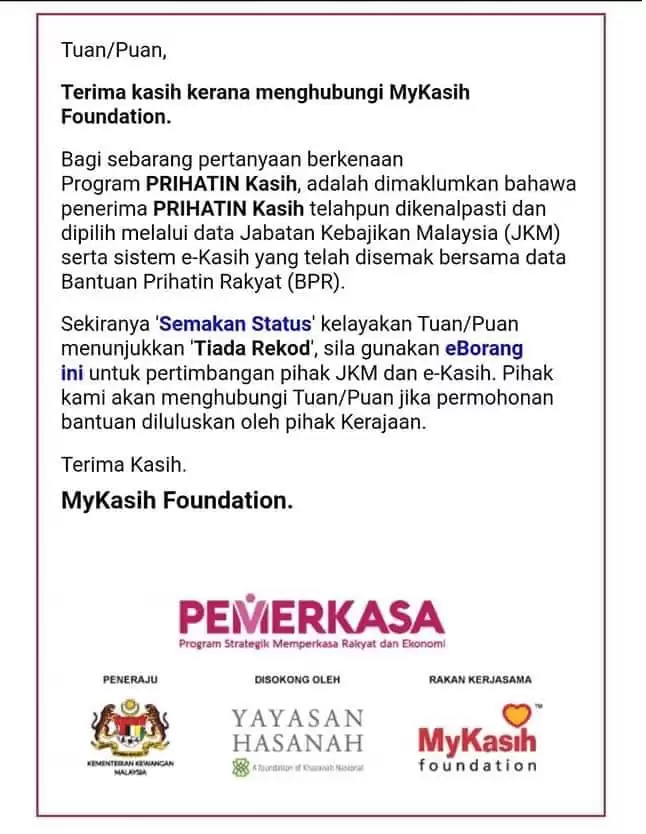 Sekiranya anda tidak layak, sila emel butiran peribadi ke info@mykasih.com atau daftar di sistem e-Kasih yang disediakan oleh Jabatan Kebajikan Masyarakat