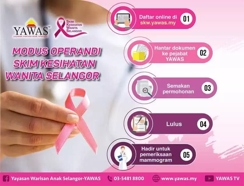Cara Mohon Pemeriksaan Mammogram Percuma. Tahukah anda Kerajaan Negeri Selangor menyediakan khidmat pemeriksaan mammogram secara percuma kepada golongan wanita yang berkelayakan? Melalui Yayasan Warisan Anak Selangor (YAWAS), Skim Kesihatan Wanita Selangor (SKWS) telah ditubuhkan. Berikut dikongsikan cara permohonan Skim Kesihatan Wanita Selangor (SKWS) secara online untuk mendapatkan pemeriksaan mammogram percuma.