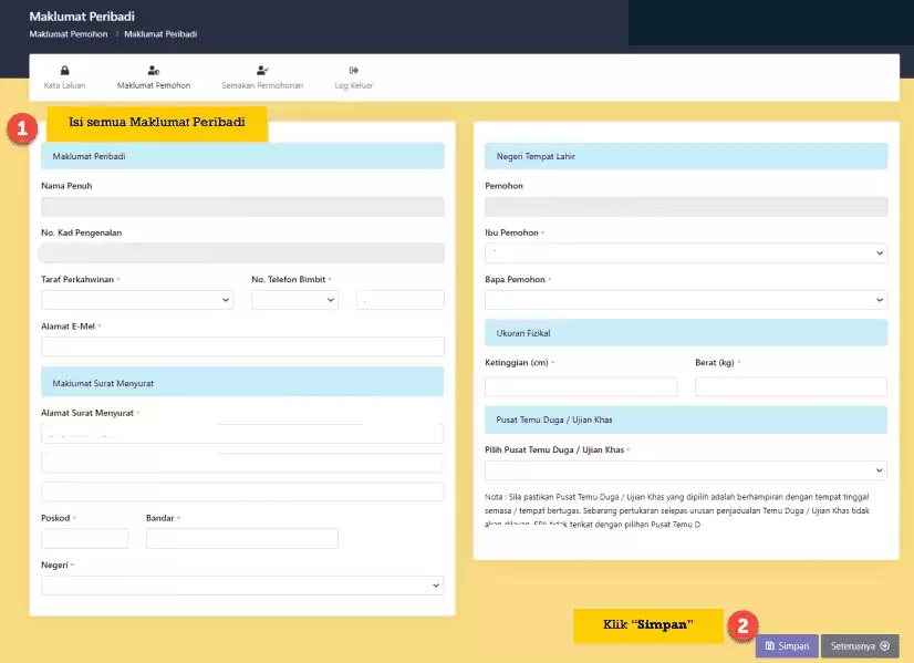 - Pastikan semua maklumat yang diperlukan diisi di borang permohonan
