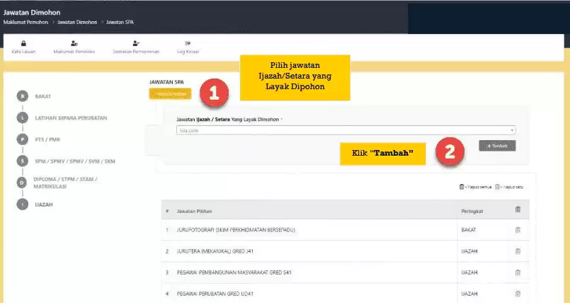 - Pilih jawatan pada ruang Jawatan Yang Layak Dipohon dan tekan “+ Tambah” bagi memasukkan jawatan tersebut ke ruang Jawatan Yang Dipohon