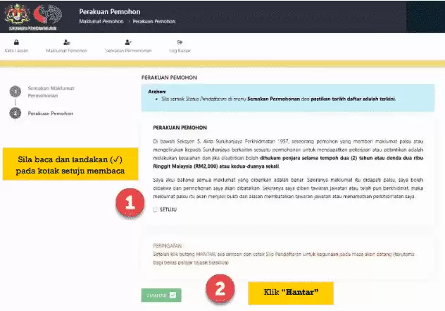 PERINGATAN: Sekiranya tidak klik butang “Hantar”, permohonan tidak akan diproses
