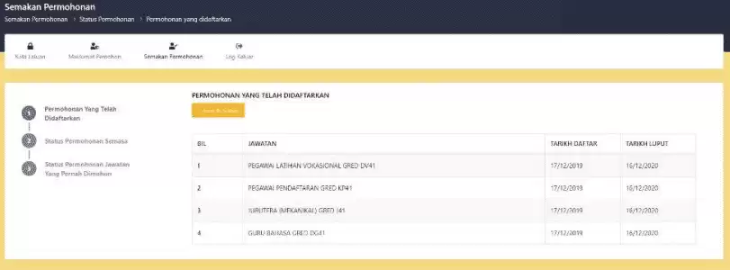 - Skrin akan memaparkan senarai jawatan dipohon, tarikh daftar dan tarikh luput permohonan (1 tahun)