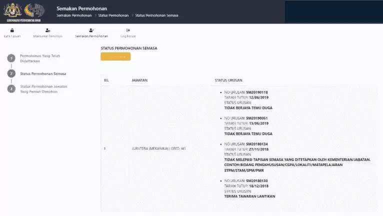 Setelah selesai membuat permohonan jawatan kosong kerajaan, pemohon yang telah berdaftar boleh menyemak status permohonan dengan klik pada pautan “Semakan Permohonan”